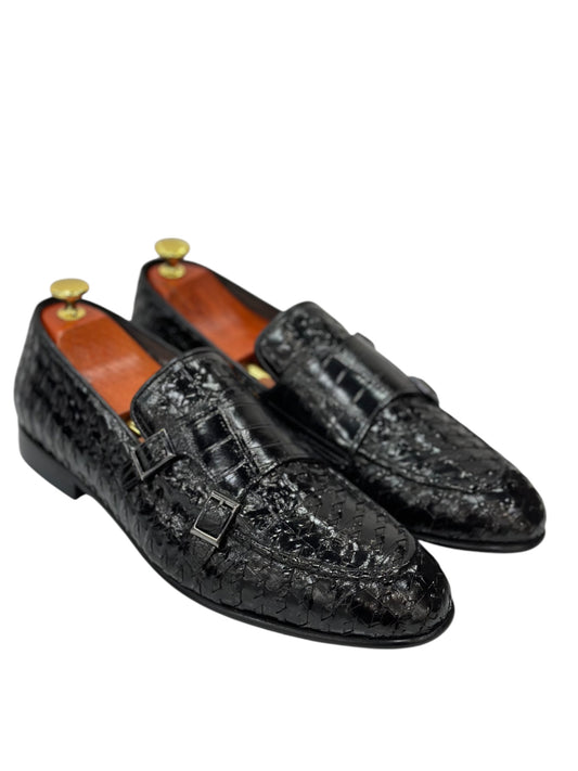 Black Textured Leather-Shiny Finish Dress Shoes-Belted Detailed on Side-117-18-323