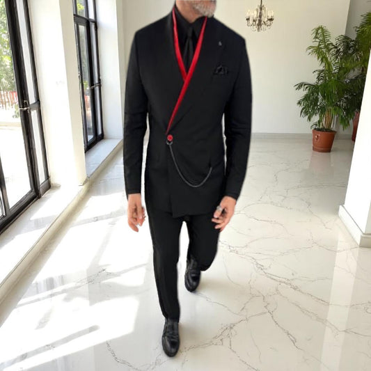 Black with A Touch of Red - Elegant Satin Collar Suit with Chain - Slim Fit