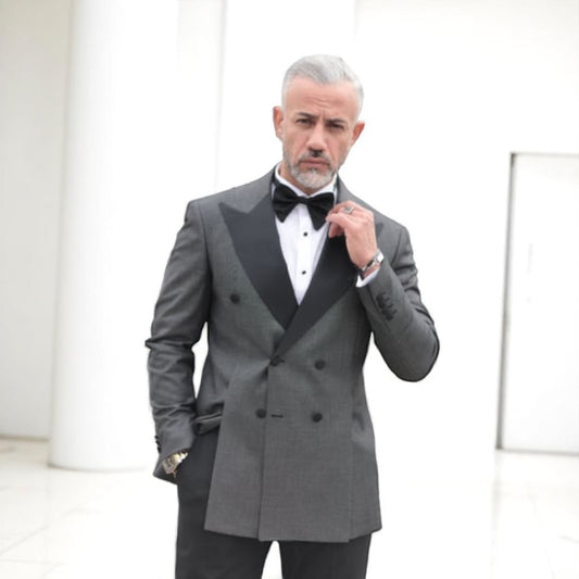 Contrasted Jacket with Charcoal Shimmer Gray and Black, with Black Pants Double Breasted Elegant Satin Collar Suit - Slim Fit