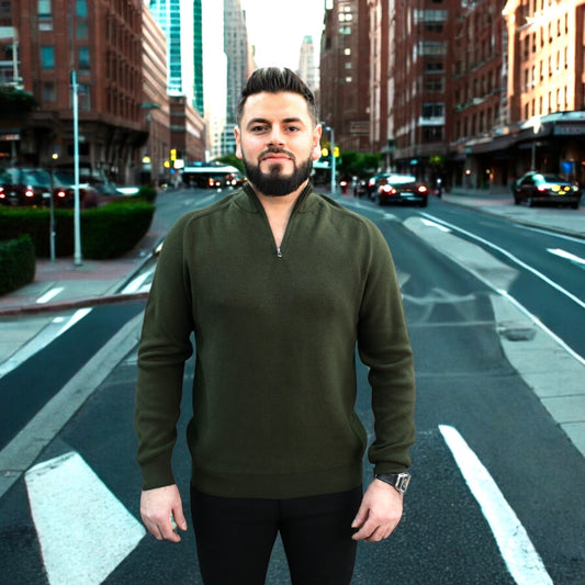 Olive Green - Wool- Quarter Zipper, Essential Sweater