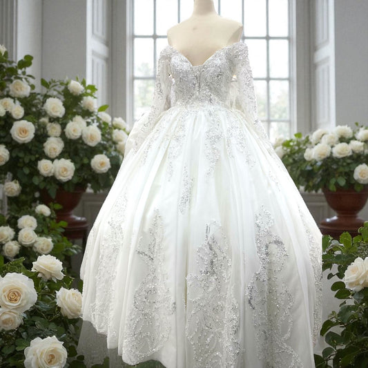 Off The Shoulder-Princess Ball Gown Style - Wedding Gown - Creamy Detailed with Sequins and Shiny Beads