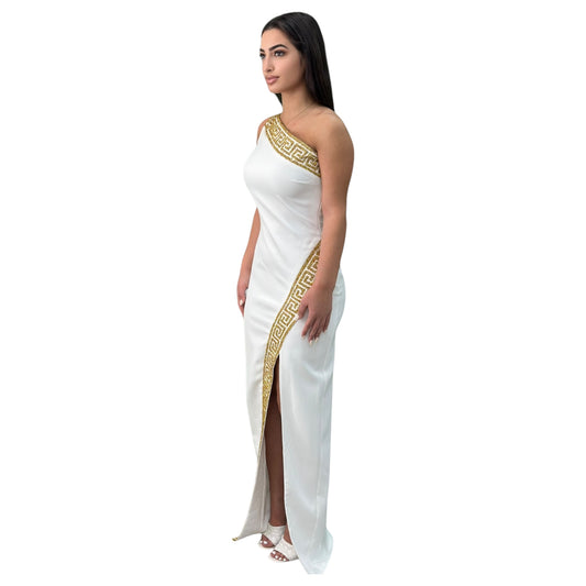 One Shouldered White Fitted Dress Beautifully Detailed with Gold and an elegant Slit on the side