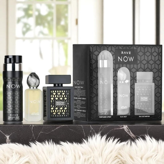 Rave Now 3 Pcs Gift Set for Men -Size: 3.4 oz / 100 ml EDP Spray; 1.7 oz / 50 ml Fresh Hair Mist; 6.67 oz / 200 ml Perfumed Spray