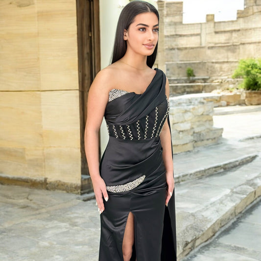 Sexy Black Long Dress- Detailed with Beautiful Satin with Crystals