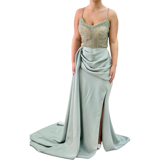 Sexy Mint Green Long Dress- Detailed with Beautiful Pearls