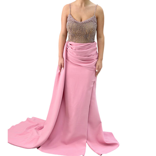 Sexy Bubble Pink Long Dress- Detailed with Beautiful Pearls