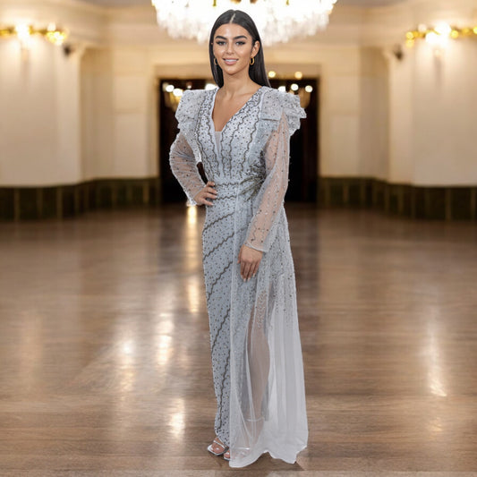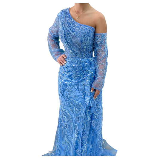 Sky Blue Elegant Long Dress-Detailed with Beautiful Crystals and Sequins